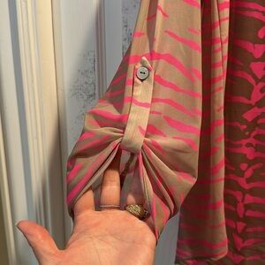 Flawed but still fabulous! Beach Bunny Neon Pink and Tan Tiger Stripe Mesh Cover Up Shirt women's size large. Slightly sheer stretch mesh material, tan with hot pink tiger stripe print, collared, buttons up front, long sleeves with tab button detail, longer length- hits mid thigh, oversized relaxed fit. Missing 1 button in middle, a few small snags- hard to see. Otherwise very good condition. Offers accepted!