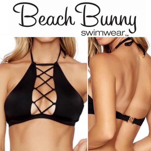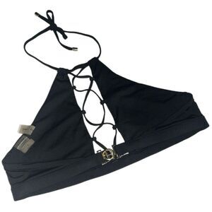 Beach Bunny Black Reese High Neck Halter Strappy Front Bikini Top Size Medium