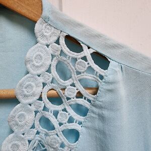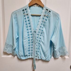 Beach By Exist Top Womens L Blue Crochet Lace V Neck 3/4 Sleeve Crop Elastic Hem