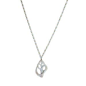 This delicate necklace features a naturally carved shell pendant and a pearl-accented chain, offering an elegant and coastal aesthetic for any wardrobe.