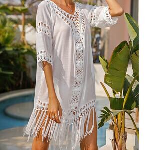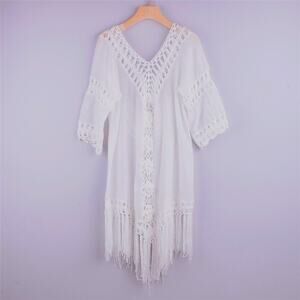 Beach Cover Up Sleeve Crochet Solid White Tassel Bohemian - Size M