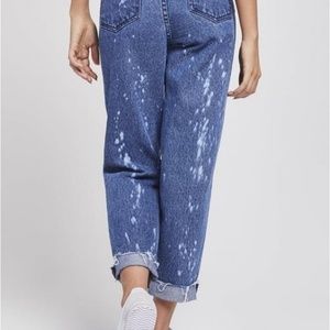 High-waisted, distressed indigo mom jeans from SikSilk. Cute and never worn. Has little flecks of bleaching on the thighs and back of legs to obtain vintage look.