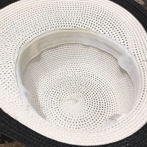 White summer hat with a black ribbon. Stained at some areas on the inside, otherwise a gorgeous piece for a hot sunny day!