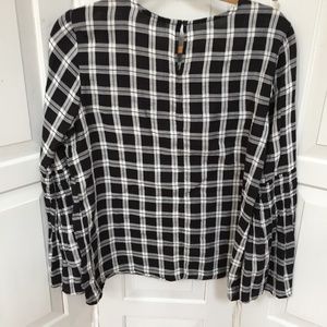 Beach Lunch Lounge black, gray, and white lightweight tunic with long bell sleeves half way down arm and button and loop closure at back of neck. Last pic of is of the end of sleeves.