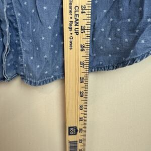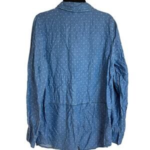 Soft to the touch lycocell fabric long sleeve button up blouse for women size small. Loose fit, could fit Medium also. All over stars print in white on chambray denim. Lightweight with pockets and buttons are covered. Tulip back hem.