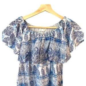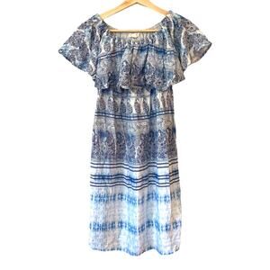 Lightweight, super soft and comfy off shoulder dress, works great as a coverup too! EUC, no flaws or signs of wear. Size XS, see photos for details and measurements. included model photo of slightly different colorway/pattern to show fit.