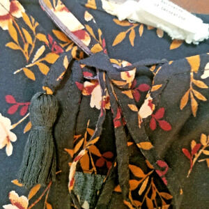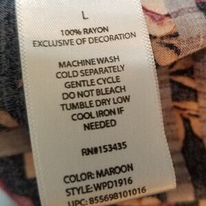 Beach Lunch Lounge dress, Size L, Material - 100% Rayon, Care - Machine Wash Cold Gentle. Tumble Dry Low; Made in India; Color Maroon, Black Oink Gray, 3/4 Sleeves w/Button Cuff, Round V-Neck with Tassel Tie, Short Length, BOHO, Prairie, Peasant, Gypsy, Pullover, Great for casual, workwear, and travel occasions, Suitable for all seasons, Hippie Flower Theme.