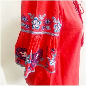 Beach Lunch Lounge Embroidered Bell Sleeve Blouse Size Small Tie Neck Coral Boho