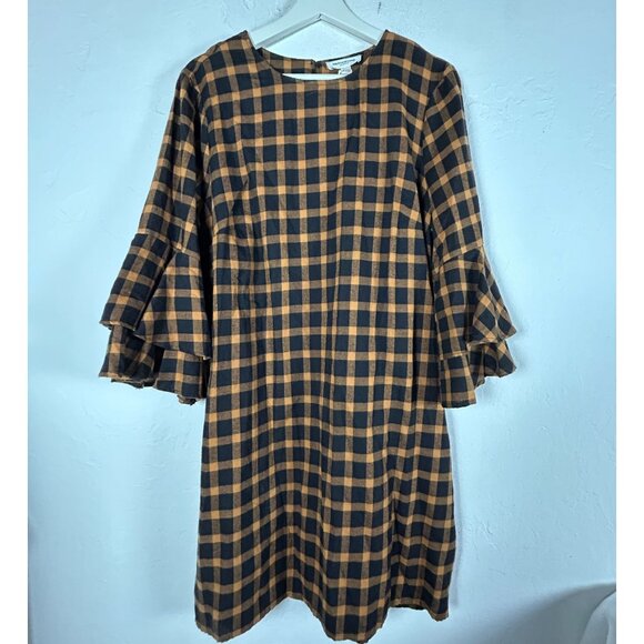 Beach Lunch Lounge Plaid Black Brown Ruffle Sleeve Delphina Dress Large New