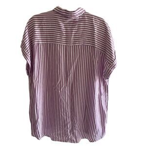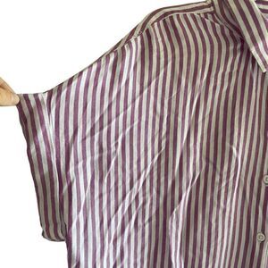 This super soft relaxed fit button front purple and white striped top is by Beach Lunch Lounge. The collared shirt has dolman drop shirt sleeves. It is a women’s size large, fantastic condition.