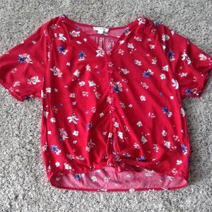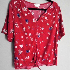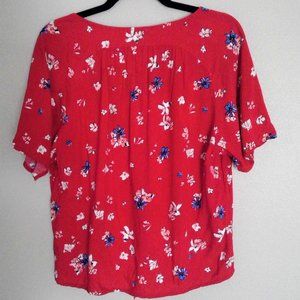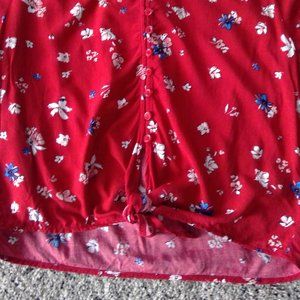 Super cute Beach Lunch Lounge. Size Medium, 22in across by 24in length. Red with flowers, tie knot at bottom, with v neck and buttons. 100%viscose. Like new smoke free home.