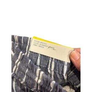 The Beach Lunch Lounge Women's Blue White Stripe Linen Blend Pull-On Capri Pant is a stylish and versatile choice for any occasion. Made from a comfortable linen-cotton blend, these pants feature a drawstring closure, elastic waist, and straight leg design. The blue and white striped pattern adds a nautical touch, while the bohemian style is perfect for casual or workwear looks. Easy to care for with machine washable instructions, these pants are a must-have for any fashion-forward woman. Margot style; blueberry mimosa color. Size medium