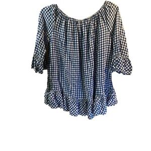 Discover effortless style with the Anthropologie Beach lunch lounge Women's Off the Shoulder Blouse in a charming blue check pattern. This versatile piece is perfect for Casual, Vacation, Classic outings, whether you're enjoying a brunch with friends or a leisurely stroll in the park. The 3/4 sleeves and ruffled hem add a touch of playful elegance, while the woven viscose fabric ensures comfort and breathability. Designed for a regular fit, this blouse pairs beautifully with your favorite jeans or a flowy skirt. In excellent used condition (EUC), it's ready to become a staple in your wardrobe.