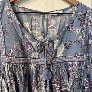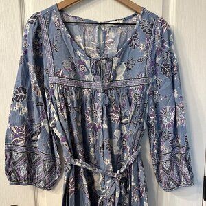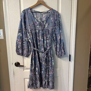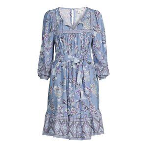 Light and airy in a soft cotton and rayon blend, it features a blouson bodice with tie keyhole in front and button keyhole in back. The self belt cinches the waist for a figure-flattering silhouette, finished with 3/4-length balloon sleeves and flouncy ruffle hem. Feminine and flattering, wear it for a romantic date night or lunch with friends.