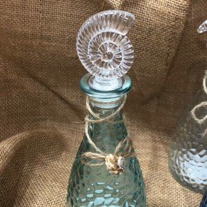 Beach Pebble Texture Seaside Glass set 3 Bottles, great for home decor beach themed, with jute twine and accented with Florida seashells. Top sea critter top Starfish in Acrylic. Color: Green, Clear, Blue/ Bottle meas: 7.625x2.75 . Length: 2.75 in. Width: 2.75 in Height: 7.625 in/ Handcrafted with loved. We Ship Quickly and Package With Care!