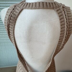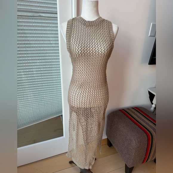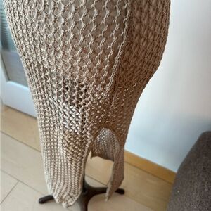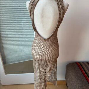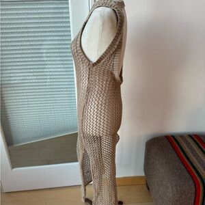 Tan crochet knit coverup. Pulls over head and has a circle open back. Higher hem.shoulder to hem 47 pit 15. Will stretch and pull wider.