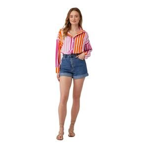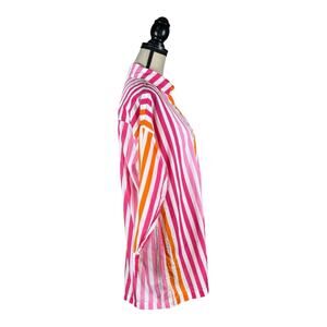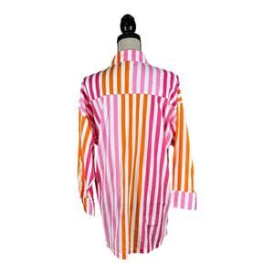 Alexa Shirt In Orange And Pink Stripe in a size small/medium. Has a full button front with one chest pocket. One button at each cuff. Can also be used as a coverup also. Measures approximately 23” armpit to armpit and 30” in length. 100% cotton. In great condition.