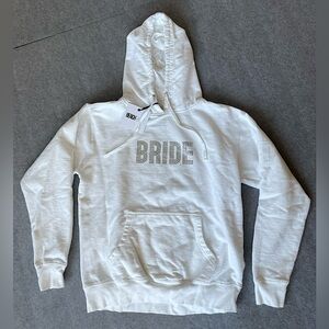 The Bride Rhinestone Sweatshirt is a crew neck sweatshirt with a hood, front kangaroo pocket and Rhinestone bride lettering across the chest.