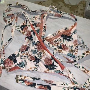 Color is an off-white ivory with terracotta / rust and floral print and crochet details. Shoulders tie on the top, and side tie bottoms. Hate letting all these go 😫