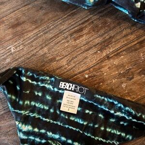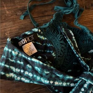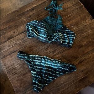 Chic bikini set with aqua and black pattern. Includes halter top and matching bottoms.