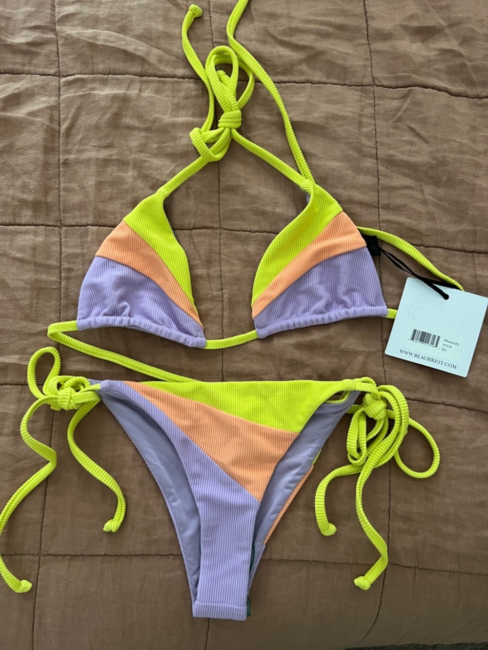 Beach Riot ribbed triangle “Olive” bikini top and “Thelma” bottom in neon yellow, lilac, and peach. Adjustable halter top and tie-side bottoms. Soft ribbed fabric with colorblock panels. Removable pads for shape. Trendy, vibrant swim set.