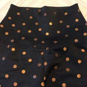 Beach Riot Black Leggings w. Rose Gold Polka Dots. High rise, full-length active pant. This black legging features rose gold polka dots. Made of polyester and spandex. Approximately 27” inseam.