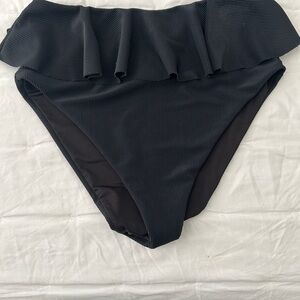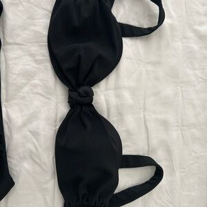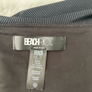 Beach Riot two-piece top and bottom with ribbed trim and brand label. Smooth black fabric with subtle texture. Clean, minimal styling for versatile wear.