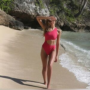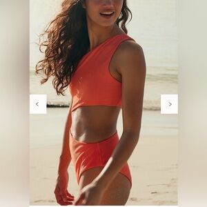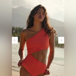 High cut, cheeky bottom detail. Still has bikini protective liner in place. In the color Peachberry.
