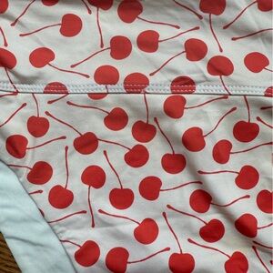 Beach Riot bikini with vibrant cherry design. Features adjustable straps. Ideal for sunny beach days. Size S/M top and large bottoms.