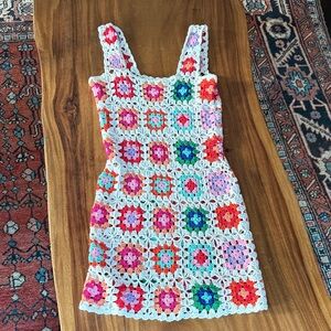 Vibrant crochet mini dress. Features multicolor floral patterns. Perfect for summer outings.