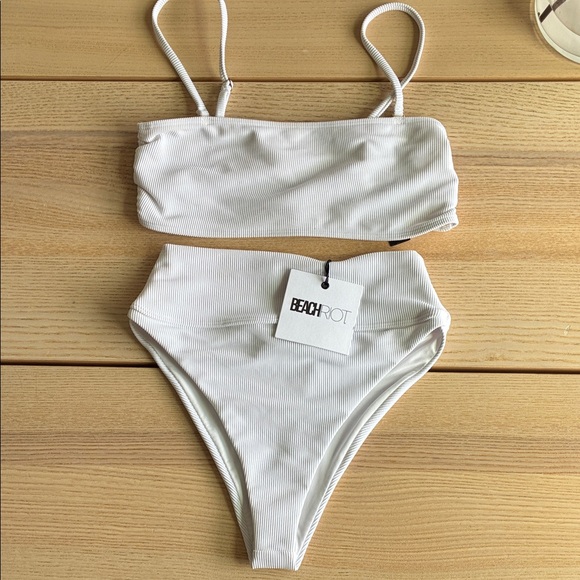 Chic ribbed bandeau with matching high-waisted bottoms. Perfect for beach days. Top worn once for photo shoot. Bottoms never worn