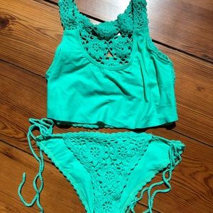 Size XS Beach Riot Crochet Bikini. Excellent condition. I bought this forever ago and never had an occasion to wear it. The bottoms I have differ from the one on the model. They are the tie side pair in the last pic.