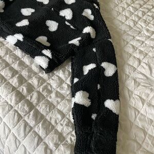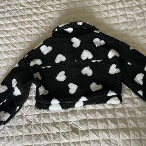 This cozy teddy jacket features a playful black and white heart pattern, offering a plush texture and cropped design for a stylish statement piece.