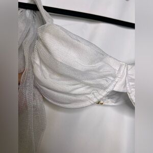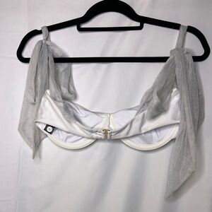 The Drea Top has Delicate straps that tie at the shoulders, and ruched underwire cups with metallic threading throughout which adds a silver sparkle to the mesh. Pair this top with the matching Joan bottom and Briar Skirt for the perfect bridal look.