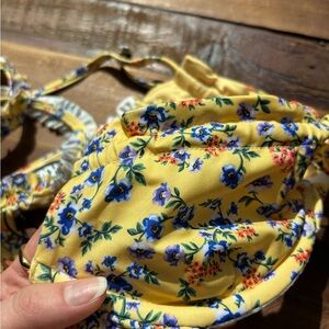 Vibrant yellow bikini top by Beach Riot. Features blue floral pattern and adjustable ties.