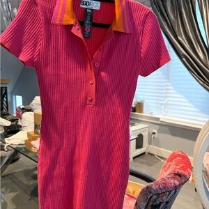 Vibrant fuchsia mini dress with ribbed texture. Features a polo collar and button-up front. Perfect for casual outings.