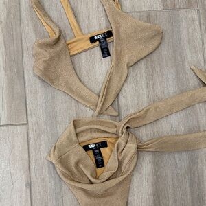 Stylish gold bikini set by Beach Riot. Features a tie-front top and high-waisted bottoms. Sparkly fabric. Worn once