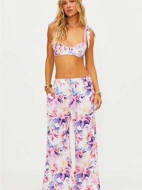 Lightweight wide-leg pants with a tropical floral print. Elastic waist for easy wear. Breezy, beach-ready silhouette. Pairs with matching tops or swimwear.
