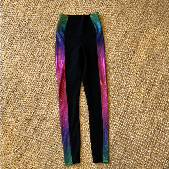 NWOT! These leggings feature a sleek black base with bold rainbow sparkle side stripe! So much fun! Made from a stretchy, form-fitting fabric, they are perfect for both exercise and casual wear. The design ensures comfort and flexibility, making them a great addition to any wardrobe.
