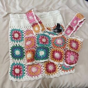 Chic crochet set with floral motifs. Features pink, orange, green, and cream hues.