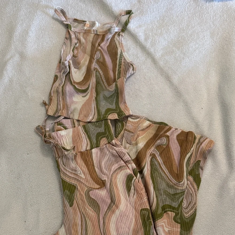 Ribbed top with a blend of earthy tones. Features subtle stripes and a soft texture.