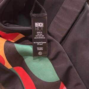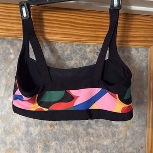 Vibrant sports bra with multicolor design. Features black straps and band. Perfect for active wear.