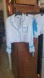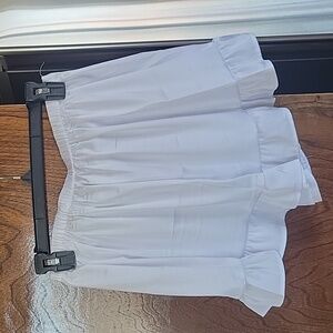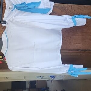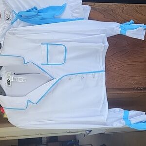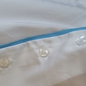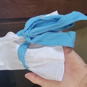 Stylish Beach Riot white pajama set with blue accents. Features a button-up top and matching shorts with a bow. Cute bows are also on sleeves. Soft satin like material.