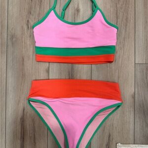 Beach Riot ribbed bikini top. Vibrant pink body with green trim and midband. Bright orange accent at hem. Thin adjustable straps.