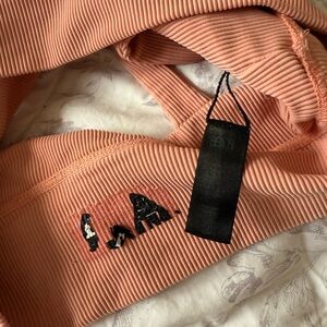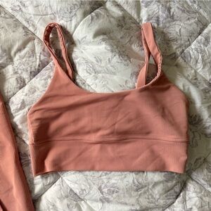 Stylish pink ribbed leggings and matching top. Comfortable and chic. Perfect for workouts or casual wear. Top is medium and bottoms are small. Sports bra tag wore off.