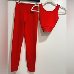 Vibrant red activewear set. Includes leggings and crop top. Perfect for workouts.