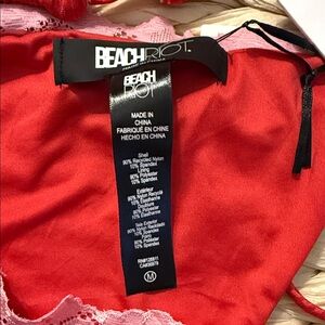 Chic red bikini set by Beach Riot. Features pink lace trim. Ideal for beach or poolside.