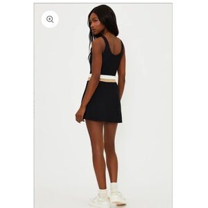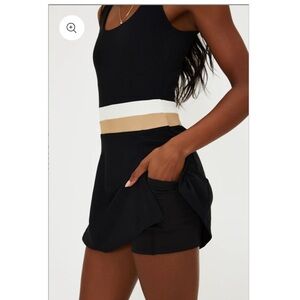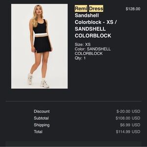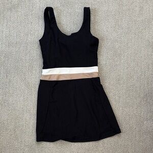 Our best-selling Remi dress in our ultra-soft ribbed fabric is the ultimate active dress, perfect to take you from courtside to bayside. Featuring a supportive shelf bra and fitted shorts with side pockets underneath. Now in our Sandshell Colorblock which is sleek black with white and tan colorblocking on the waistband.
