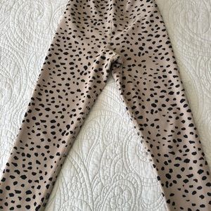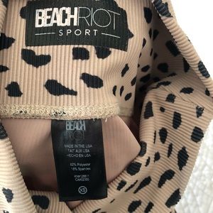 The Ayla legging is a full-length active pant in Beach Riot's taupe spot print on extremely comfortable ribbed fabric. The high-rise waistband makes them perfect for any workout. Worn once. Still have the tag for them. Small pull on leg (shown in last pic) not noticeable because of ribbed fabric.