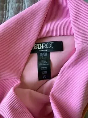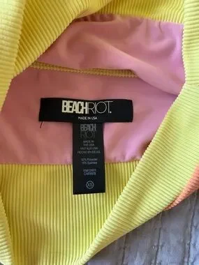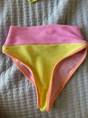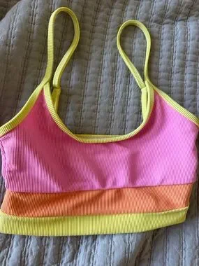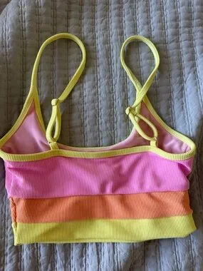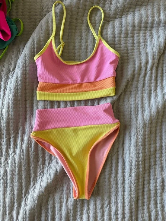 Ribbed bikini in size xs. Ribbed material, adjustable shoulder straps yellow, pink and orange colors. Smoke free home. Lots of beach riot swim in closet.